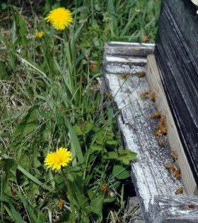 Dandelions are great. The beekeeper’s friend. They are native to Europe, Asia, and the Americas, so before honey bees arrived here in the 1600s, they must have been a fantastic feast for the wild bees. Honey bees love the showy little flowers – for most northern-hemisphere beekeepers, dandelions are the first really big meal of the honey season. After the first flush of crocus, willow, and maple, which bloom when the weather is still cool and unstable, the “lion’s teeth” as the French named our “dent-de-lion” are welcome for their enormous yields of pollen and nectar. I have seen bees store 20 kilos (40 pounds) of honey in just two peak weeks of flow. I’ve also seen relatively weak hives explode in population. Dandelion season, you see, is also the real beginning of swarm season. Hope your neighbourhood bees have had their fill from this under-rated weed. And hope they have resisted their natural temptation to flee to the trees!