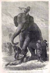For centuries, humans have used elephants for work, warfare, and entertainment. As you can see in the pictures below, elephants have been employed in temples as living totems of Ganesha and executioners in India (the second image below is fuzzy, but it is an 1868 sketch of an elephant being forced to kill the man whose head is on the block). Elephants have given us circus entertainment in North America (as in Dumbo and Jumbo among thousands of others) and they have worked as draft animals throughout southeast Asia and general labourers in Europe (the last photograph below was shot by a US service man in Hamburg in 1945 – the elephant is cleaning up WWII debris after Allied bombing).