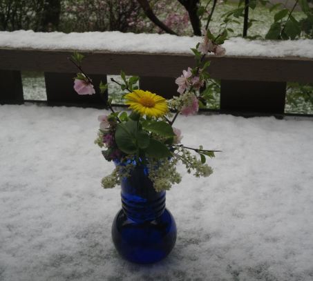 My kids picked these flowers as a Mother’s Day gift for my wife. All the blossoms were collected from the yard around our house. Nice bouquet, eh? There is not much in the vase that a honey bee would find attractive (except for the apple and cherry blossoms) but the kids’ mother really liked the little bouquet. The flowers were picked on Saturday, the day before Mother’s Day. It was 21° C (70° F). Then it snowed. A big heavy snowfall with gigantic flakes. Made me wonder about those flowers still out on the shrubs and trees.