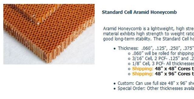 Aramid Honeycomb is a lightweight, high strength, nonmetallic honeycomb manufactured from aramid fiber paper. After the honeycomb is formed, it is coated with a heat resistant phenolic resin to increase its strength. The core material exhibits high strength to weight ratio, low density, and is very bondable. Aramid honeycomb is becoming increasingly used in high-performance non-aerospace components due to its high mechanical properties, low density and good long-term stability. The Standard Cell honeycomb is manufactured with the typical hexangular cell shape.