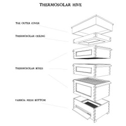 The hive is basically an insulated version of the familiar vertical hive of stacking, frame-holding boxes with solar heating built in. When treatment is required, the beekeeper removes the outer cover exposing a “thermosolar ceiling” to the sun. When the built-in thermometer indicates 117F(47C) the cover is restored and this elevated temperature is maintained, causing mites to fall off and die while not harming bees or brood. Such is the claim anyway. What is our take?