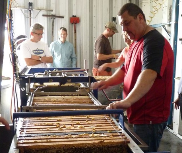 I’ve spilled many a pixel raving about the Calgary Bee Club and its education programs, school outreach, swarm collection, bee community projects, honey shows, and diverse meetings, so I won’t do that again today. Instead, I have a few photos (thanks to Liz Goldie) from one of our club’s weekly summertime “Saturday at the Hive” events. A couple of weeks ago, my friend and fellow bee instructor Neil Bertram invited 35 of his closest friends to see his bees and tour his off-grid honey shop in central Alberta. Neil runs a bit over 300 producing hives and makes about 60,000 pounds of honey almost every year. He wholesales most of it and he keeps his costs down by doing his own building, repairing, beekeeping, and extracting.