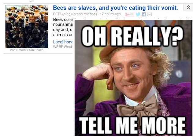 This headline showed up in my beekeeping news feed this morning. It’s a disgrace to the cause of fighting against the abuse of animals and it shows total stupidity of the subject on the part of the PETA writer responsible. By headlining false, poorly-researched opinions and presenting them as facts, credibility for the worthy cause of defending apes, dogs, horses, chicken, cattle, and other mammals and birds is lost. Honey bees are not enslaved, and honey is not bee puke – however, it’s the inane slavery remark that leaves me gob-smacked.