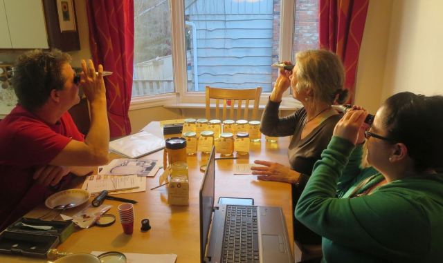 They look like pirates, don’t they? But these honey judges, under the direction of Chief Honey Judge Stephen, are checking honey viscosity (a proxy for the moisture level) of the entries in the “Aggie Days Honey Competition”.