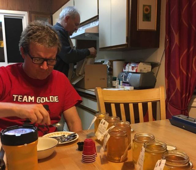 I understand what you mean. The problem we have is that taste is subjective. Some of the judges love dark, strong honey and think that the white mild stuff is syrupy and flavourless while others love beautiful white alfalfa honey and think that buckwheat honey tastes like medicine. That’s why these contests tend to be so sterile – looking for minor flecks of wax in the jar and fill-level of the jar. We do taste for signs of overheating (caramelizing) or moisture issues (souring). While doing that quality check, we observe the flavour appeal. When several judges are involved (in this case, four of us), we note the ‘nicest’ (in the humble opinions of the judges) and then we re-taste them at the end of the main judging. We have a secret ballot, ranking the ‘Judges’ Choice‘ in terms of flavour. After the vote, we tally up, giving us a so-called ‘best tasting’ honey which gets a special award.