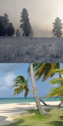 British Columbia is much milder than Alberta in the winter. Rather than letting bees sit on the frozen prairies, about 15% of Alberta hives spend the winter near the Pacific coast. An inaccurate contrast is illustrated in the photos to your left.