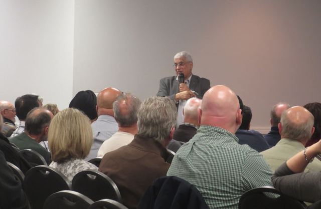 Liz Goldie, front right and Medhat Nasr, front left,  addressing the capacity turnout for the monthly Calgary and District Beekeepers’ Association.