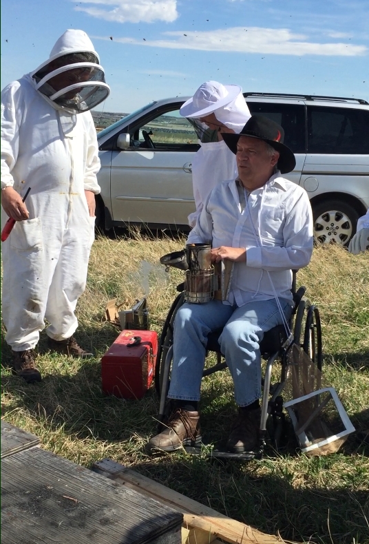‘Tis I, to your right, in the wheelchair. I’m holding a red metal box which I picked up at Canadian Tire (a hardware/car parts chain). The box was part of our safety demonstration – 2017 is Prevent a Fire in Your Bee Yard Year.  Smoker safety is incredibly important. I haul my smoker inside the metal box where flames gasp for air and sparks fall on steel walls.  Consider such a box in your future.