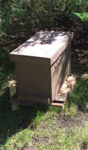 The bees survived two hours of bagged darkness with no audible complaints. At home, my 15-year-old was waiting for me. He off-loaded the hive. We started to peel off the bag while the nuc was still inside the parked van, but decided to leave it partly covering the box when we realized that some bees had found a way around the screen. Those strays stayed safely in the bag. We freed the nuc and the escapees, placing the hive in our yard.