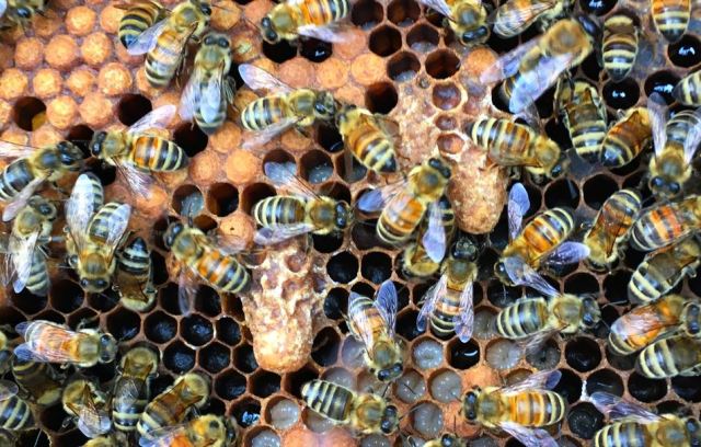 Day 6 of a queenless nuc: sealed queen cells amidst risk-taking bees.
