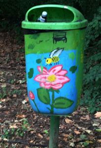 I wonder who the waste can artist was. Other dispensers in the park were more profanely annotated than this one. Was this artwork added under cover of twilight, or was there a cheering entourage of fine arts and beekeeping enthusiasts on hand, encouraging the itinerant painter? I shall never know.