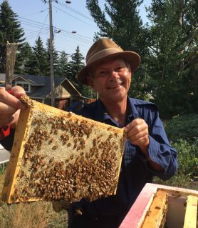 I fell into this train of thought when a neighbour here in Calgary invited me to take a peak at his bees. It’s Mark’s first year beekeeping. He’s doing well. His single hive, established in early May from a package, has grown from its initial single box. Now it fills four deep chambers and two shallow supers. Mark wanted my opinion on the bees’ strength, honey harvest, and winter prospects.