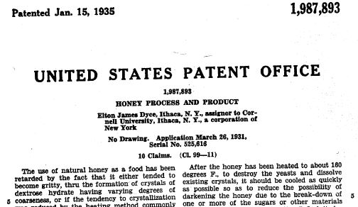 At age 28, Elton Dyce moved to Cornell University in New York to work on a Masters’ in entomology. Until he developed his system, most efforts to improve honey focused on heating it. This resulted in longer-lasting liquid honey, but Dyce felt that such honey wasn’t what consumers wanted on their tables. At Cornell, he continued to work on the Canadian honey problem. Three years later, he filed US Patent 1987893, simply called “Honey Process and Product“. He began his patent claim by stating that the use of honey is inhibited because it can be gritty and inconsistent unless heated. Then, he said, such liquid honey becomes drippy and harder to use. Dyce had a better idea. In paragraph 4 of his claims, Elton Dyce spelled out his system: