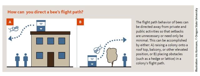 This is a well-organized, well-written, and well-illustrated manual. For example, here’s a simple figure showing how to reduce pedestrian contact with your bees. As most beekeepers know, honey bees very rarely sting when they are away from their hive (unless you bare-footedly step on one or try to pick one off a flower – then, I’m sorry, but I’ll side with the bee on this). Close to their nest, however, bees can become rudely defensive. Foot-traffic along a pathway in front of a hive entrance almost always causes trouble for the bees and for pedestrians. Thus, this simple but appropriate drawing:
