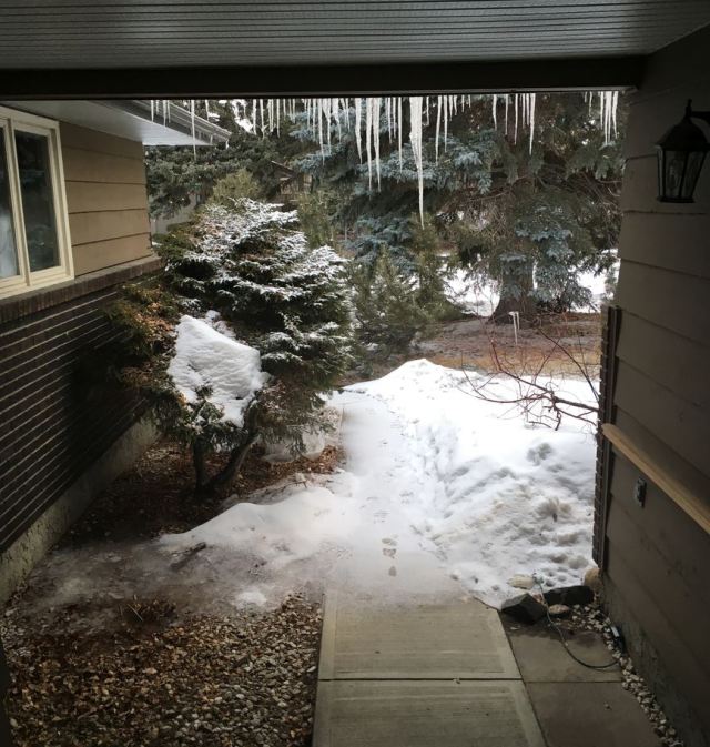 Back to our cold spring weather. Yesterday was brutal. It began at minus 24 °C here in Calgary. The high was about -11 °C, but the wind was wicked – it felt like minus 40 to me. I hope it warms up soon. We have a couple of packages of bees flying in from New Zealand in two weeks. (Boy, will their wings be tired by the time they arrive!) The forecast teases that it will be above freezing by then. I hope so. Meanwhile, here’s what our breeze-way looked like this morning, April 7, 2018: