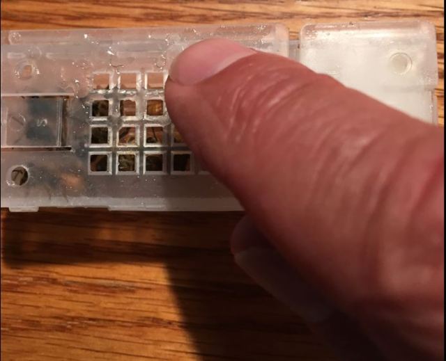 Next, I tap my finger into a bit of water so that a droplet sticks to my finger. Then I touch the screen again, this time with the drop of water. You will likely see the bees stick their proboscis into the droplet which will disappear in seconds. I don’t over-feed or over-water the queen and her attendants. Never let the bees become wet or sticky. If you somehow decide that it’s in the bees’ best interest, you might offer a second or third drop, but only after the preceding one has been thoroughly cleaned up. I usually just give them a drop each morning and evening though that’s far from a scientific calculation of the bees’ needs.