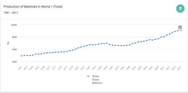 At the United Nations Food and Agriculture Organization website, FAOSTAT, you can now download the latest 2017 data on the number of managed bee hives worldwide across 125 countries (though not my own country, the UK!). The individual country data can be downloaded as a juicy detailed spreadsheet or the data can be visualised in interactive attractive graphs for you in the Visualize data section – this tells us that there was a worldwide total of 90,999,730 hives (up slightly from 90,564,654 hives in 2016).