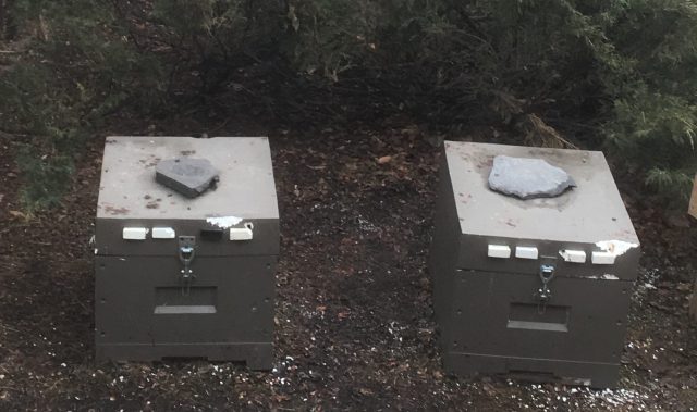 So, both of our backyard colonies survived. One is just fine – it even had sealed brood spanning three frames. The other is really weak – maybe a pound of bees and just a single patch of brood. I’ve ordered a new package which I’ll install over screens above the weak hive, then eventually combine the weak colony and the package. Maybe I’ll have a two-queen colony for a few weeks in the spring, we’ll see.