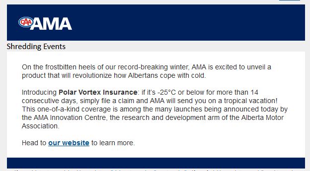 Our local Auto Club (Alberta Motor Association) is offering Polar Vortex Insurance. This is a great new feature (for members only) – if the temperature stays at -25C, or colder, for any 14 consecutive days, each paid-up member gets to file a claim with the insurance company and collect a 14-day tropical holiday.