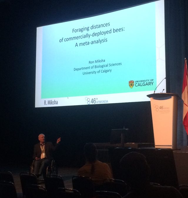 On Thursday at the Montreal Apimondia, I gave a presentation about the average distance bees fly while foraging. The full title was Foraging distances of commercially-deployed bees: a meta-analysis. When I find some time, I’ll do a voice-over and create a version of the talk that you can watch. The bottom line is that there is really no single, simple answer – foraging distance is highly landscape-dependent. This is important. Whether you are a farmer trying to figure out where to place rental bees for efficient, economical pollination or a land manager trying to reduce the effects of high-density non-native bees, you need to know where the bees will be flying. The presentation included foraging distances, which I’ll talk about in another post, another day.