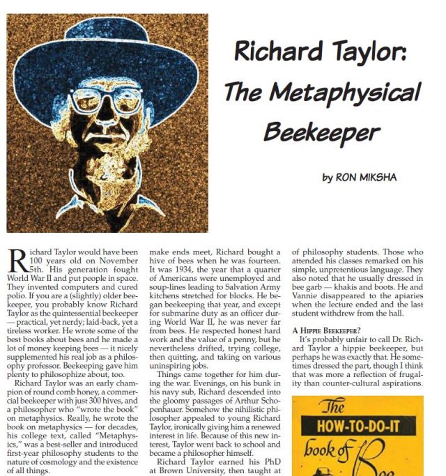 I certainly could not let this year pass without a note or two about Richard Taylor, American beekeeper and philosopher. He would have reached 100 years in November. Alas, he expired seventeen years earlier.