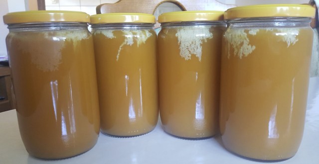 So, a variety of opinions on the cause of frosting. Most answers focus on temperatures (of jars and of storage conditions), on air trapped in the honey, and on moisture (most said ‘too much’ but answer #2 suggested the honey’s moisture was too low.) There was also a comment on honey variety – poor blending of two different varieties, or simply the fact that some honey may be more prone to frosting because of sugar chemistry.  There was also the suggestion that fermentation or excessive wax/pollen caused this, though I don’t think that’s right.