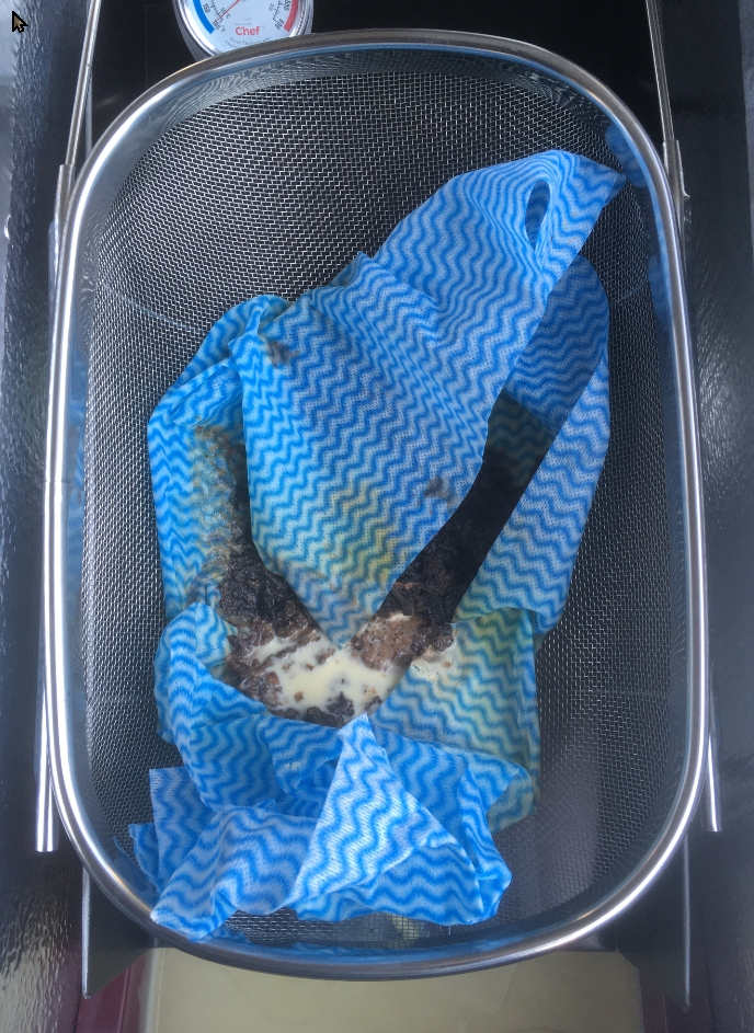 To keep debris out of the wax, we use a disposable dish cloth (a roll of 50 will cost less than $10) – disposable, but also reusable (we run three or four cycles on each, depending on how much junk is in the wax being melted). Here in Calgary, the melter only works on bright sunny days, though melting begins at ambient temperatures as low as 15C (60F). We usually revolve the box three times (or whenever we think about it) to catch the most direct sunshine. We don’t use any water in the plastic tray that catches the wax drippings. If the wax is from fresh cappings, there will be quite a bit of honey in it, which will be dark but not burnt-flavoured. I save it for my tea.