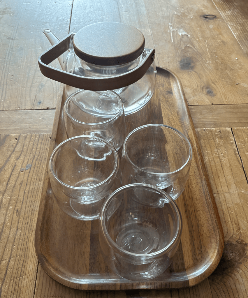 Our set came with an acacia serving tray and hand-blown cups and kettle. The double-layered insulated cups are especially nice because we can watch the honey dissolve in the cup. It’s a winner, a keeper, and about $100 US – here’s a link. It arrived safe and very durably wrapped, direct from the tea set factory. Go get it and enjoy!
